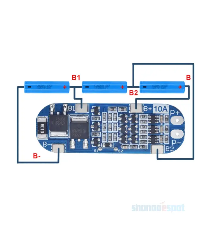The 3S 10A Lithium BMS is a compact and reliable battery protection board designed for 3-series (3S) lithium-ion battery packs with nominal voltages of 11.1V and a maximum charge voltage of 12.6V. This board ensures safe battery operation by managing charging, discharging, and current flow while protecting each cell from electrical damage.