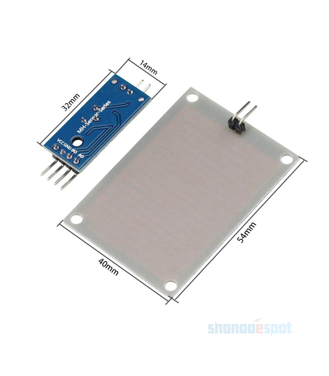 The module includes a rain board and a control board that is separate for more convenience. It has a power indicator LED and an adjustable sensitivity through a potentiometer. The module is based on the LM393 op-amp.