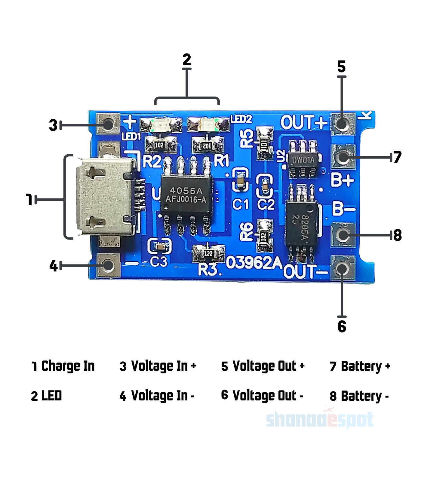 💡 With dual LED indicators, you can easily monitor charging progress — Red LED for charging and Blue LED for full charge. Compact, durable, and efficient, this module is an essential component for Microcontroller projects, solar chargers, DIY power banks, IoT devices, and robotics applications.
